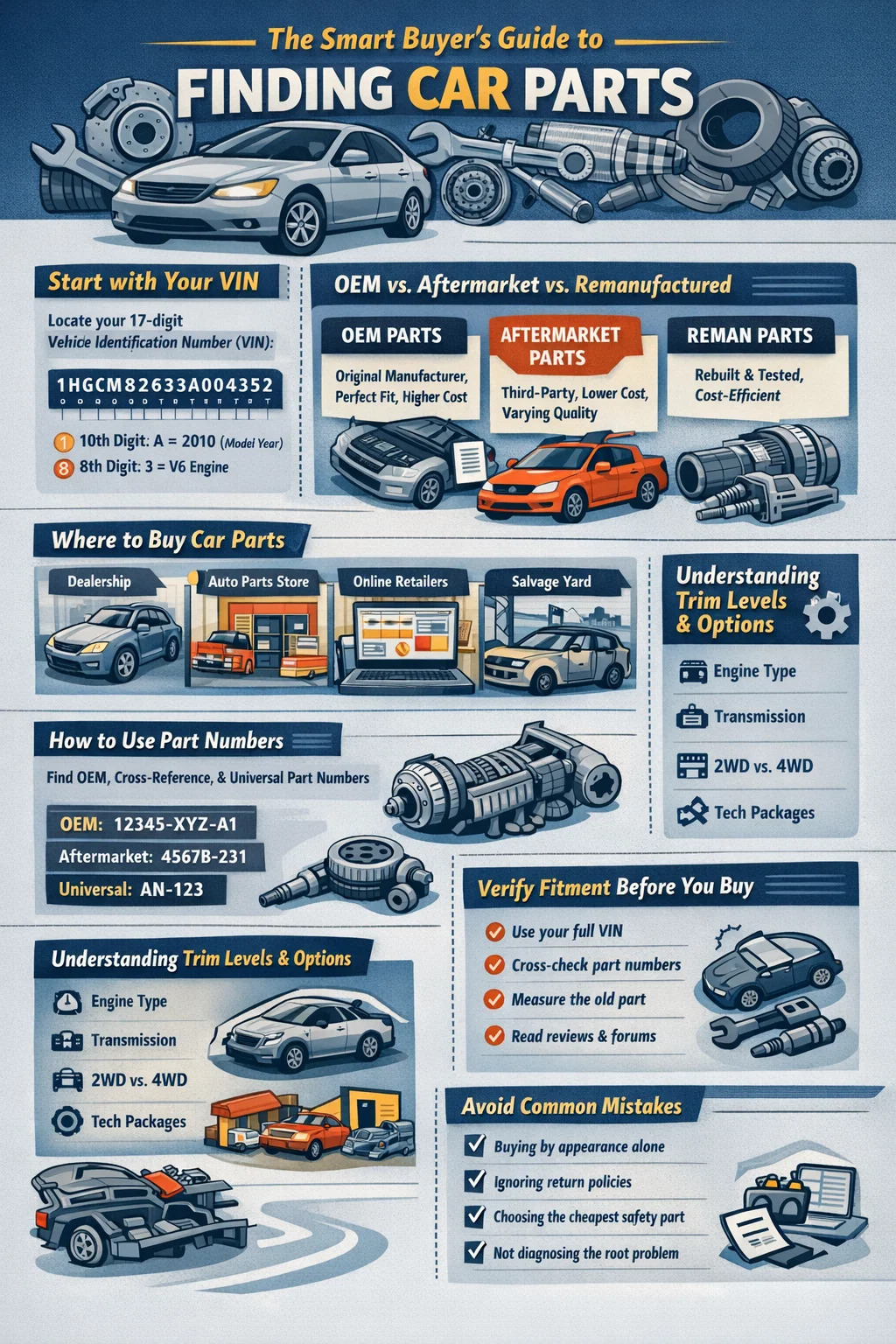 年式、メーカー、モデルが正しい場合でも、取り付けミスはほとんどの人が予想するよりも頻繁に発生します。年半ばの生産変更、地域市場の変動、オプション パッケージの違いなどにより、同じモデル名を持つ 2 台の車に異なる部品が必要になる可能性があります。購入する前に適合性を確認する方法は次のとおりです。