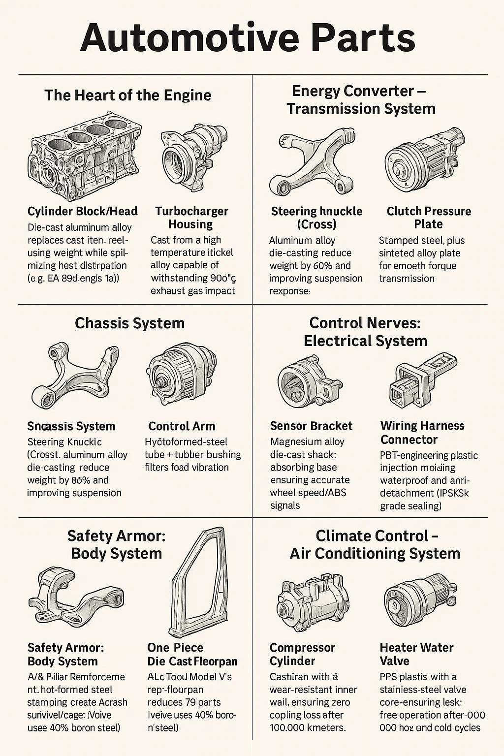 自動車部品 車両を構成する何百もの機能ユニットで構成され、6 つの主要なシステムに分類されます。