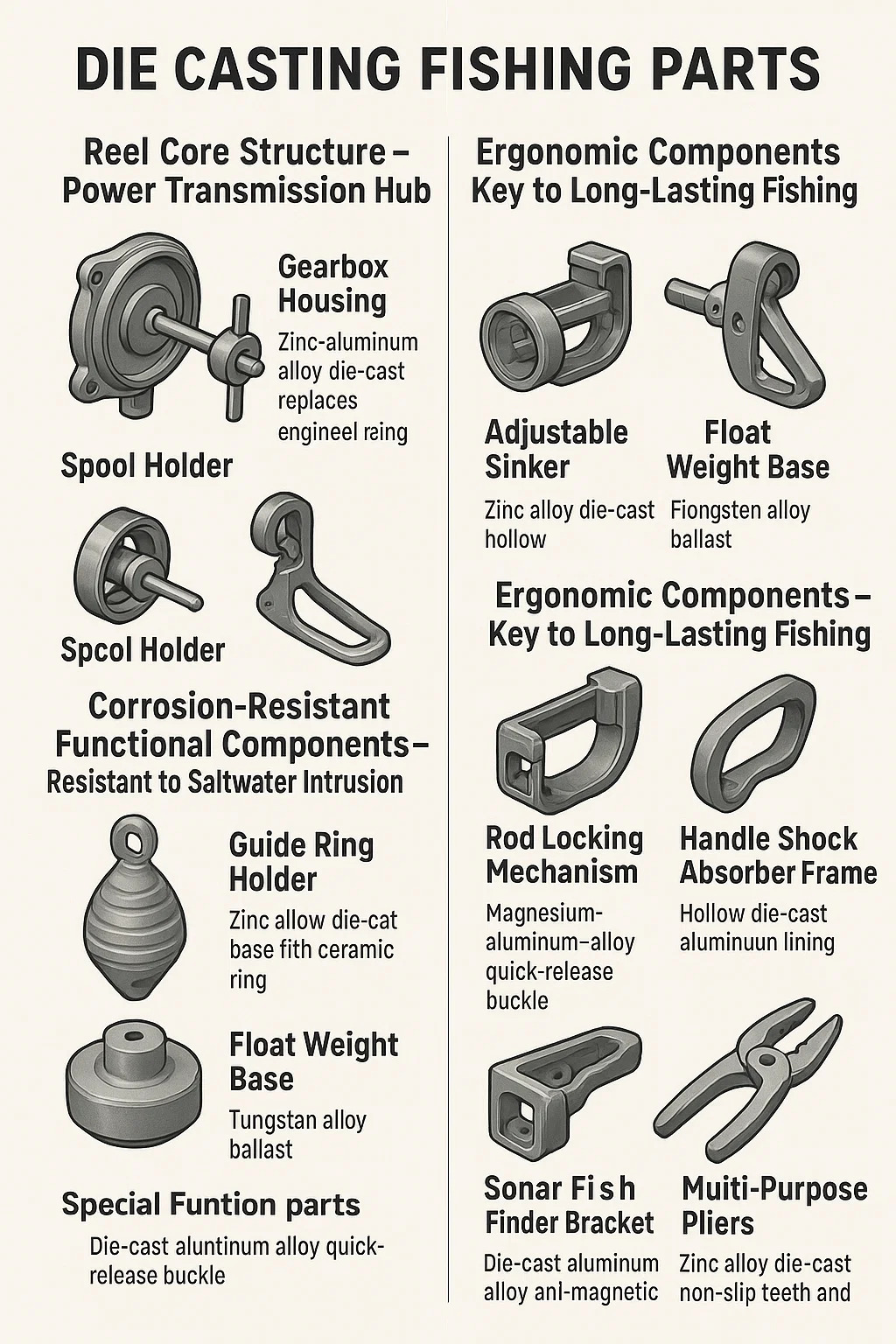 釣りの部分をキャストします 高圧鋳造プロセスを使用して製造されたコアメタルコンポーネントです。彼らは、軽量化、腐食抵抗、機能的信頼性などの主要な釣り道具の要件に対処しています。主要なアプリケーションと機能は次のとおりです。