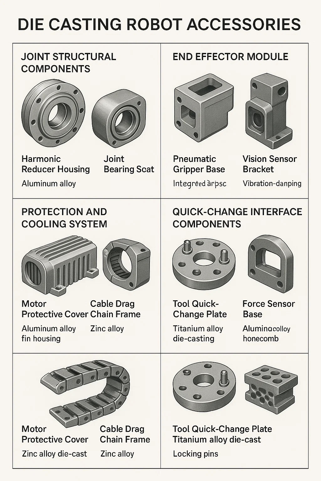 ダイカストロボットアクセサリー 高圧鋳造プロセスを通じて製造されたコア金属コンポーネントです。これらは、精度、軽量化、耐久性などの産業用ロボットの中核的な要件に対応しています。主なアプリケーションと機能は次のとおりです。
