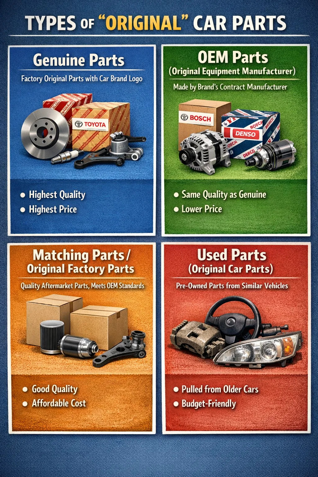 「オリジナル」自動車部品について話すとき、実際にはいくつかの異なる用語が使用されます。 これらは似ているように聞こえないかもしれませんが、整備士や自動車部品店のオーナーの口では、これらの異なる用語は、多くの場合、異なる価格帯や起源を表しています。 自動車部品 .