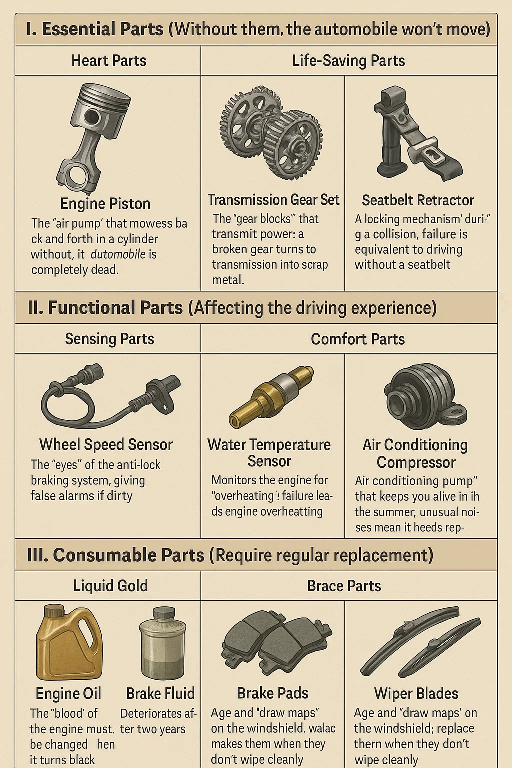 自動車部品 自動車を構成する「器官」です。重要な部品が欠けていると自動車は動作不能になりますが、余分な装飾部品はそれをより派手にするだけです。